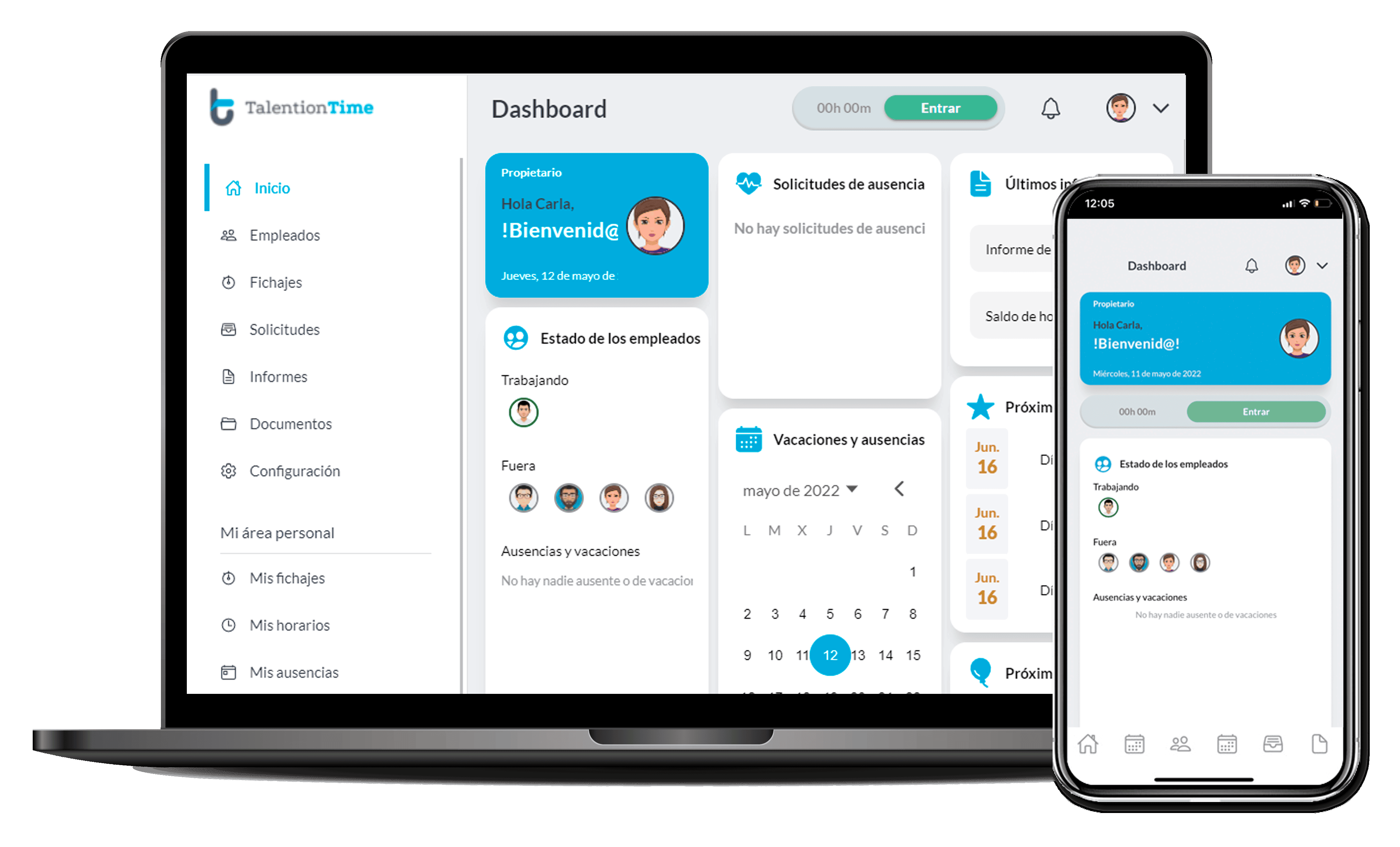 TalentionTime es el software de gestión de RRHH que te permitirá además de gestionar fácilmente el registro de jornada de tus empleados, el envío de documentos, firmas y solicitud de vacaciones y días de asuntos propios.